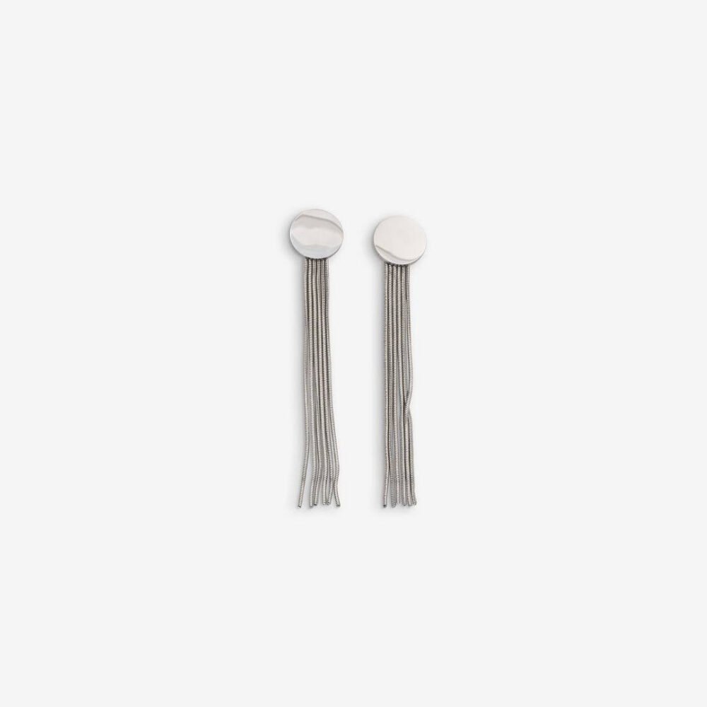 Boucles d’oreilles en acier inoxydable présentant une plaque circulaire d’où part une cascade de filaments métalliques.