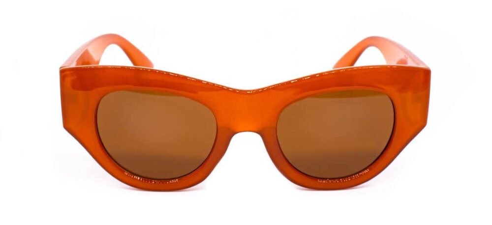 Lunettes de soleil inspirées d’un célèbre best-seller dans lequel le « diable » s’habille griffé. Modèle parfait pour une femme au caractère fort et au style impeccable. Elles présentent une monture brillante orange et des verres aux nuances marrons.