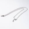 Parure composée de pendants d’oreilles et un collier en métal rhodié: les pendants d’oreilles sont embellis par une perle et une série de petits zircons incrustés à la main qui termine avec le zircon le plus grand; leséléments qui se trouvent sur le pendentif du collier entourent une perle centrale.